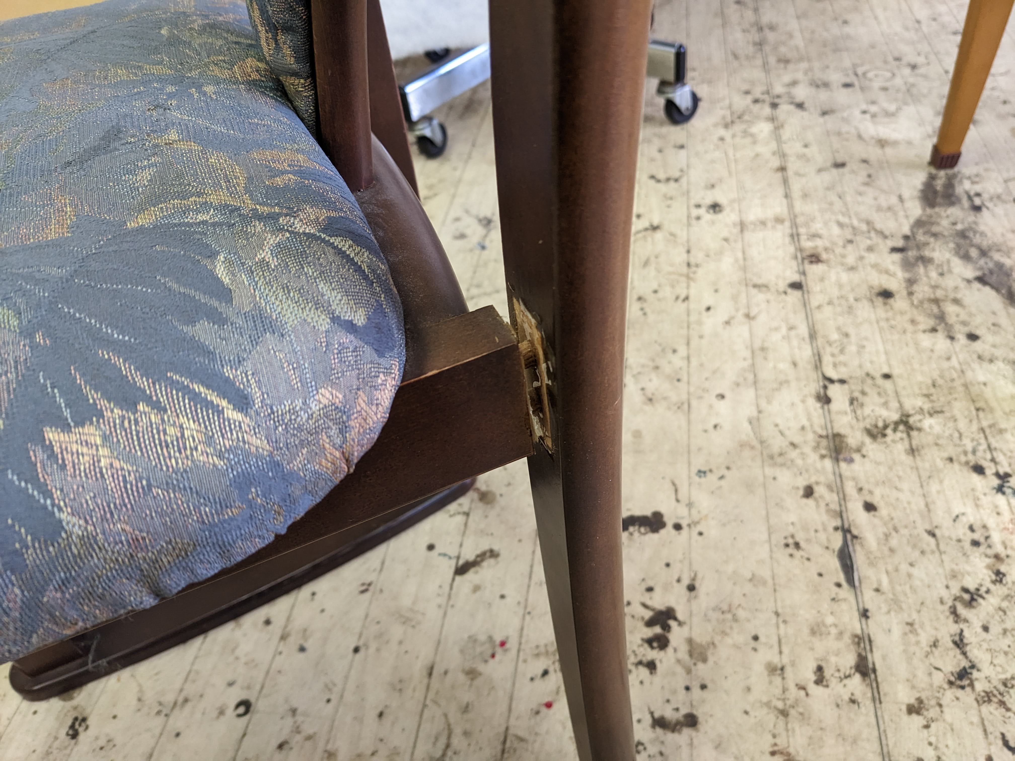 今回修理ご依頼いただいた椅子は何十年も使っておられたドレッサーチェアで元は布張りの椅子で生地がの汚れとクッションのヘタリ、そしてフレームの結合面の緩みと剥がれによる修理になります。