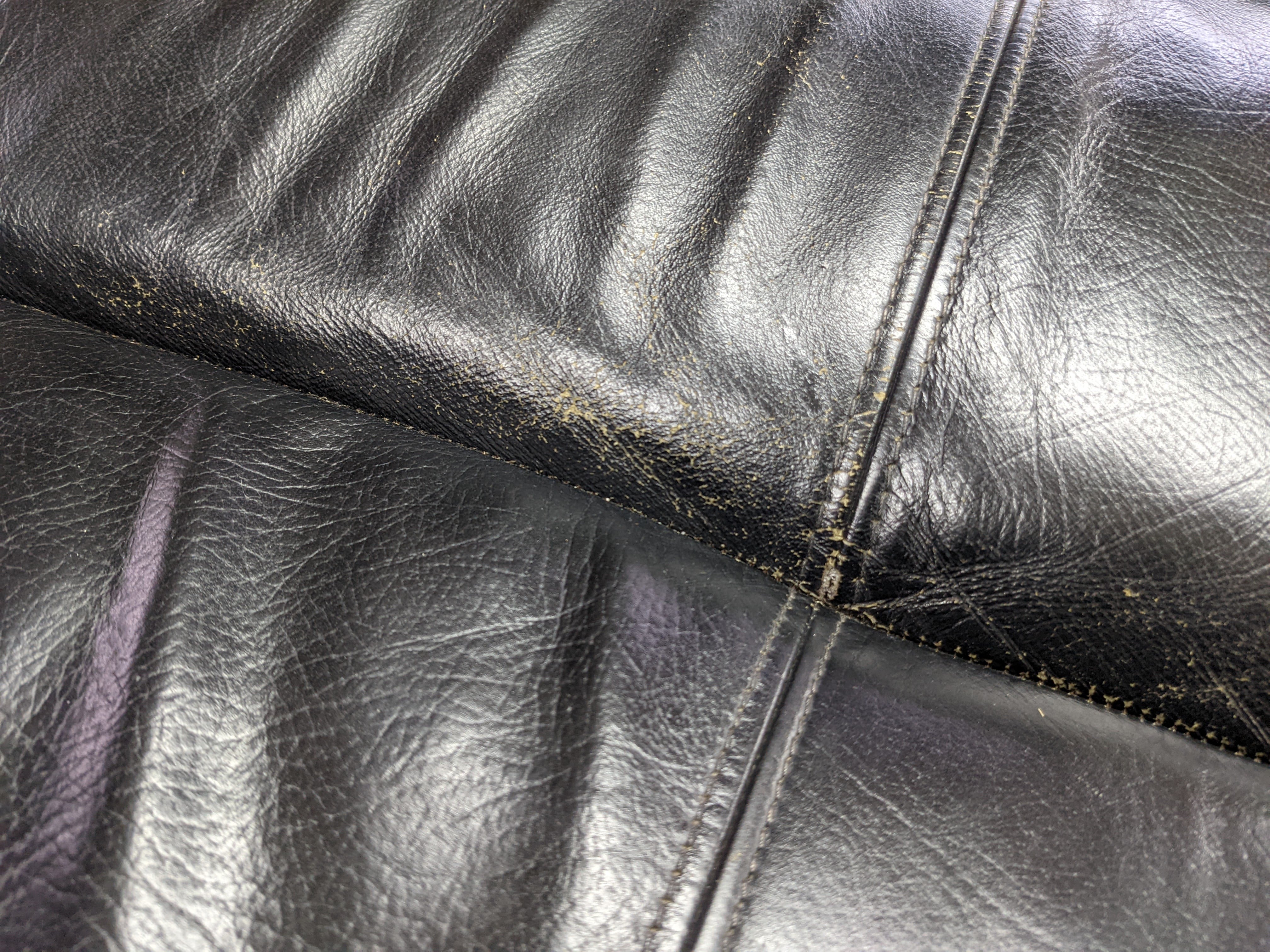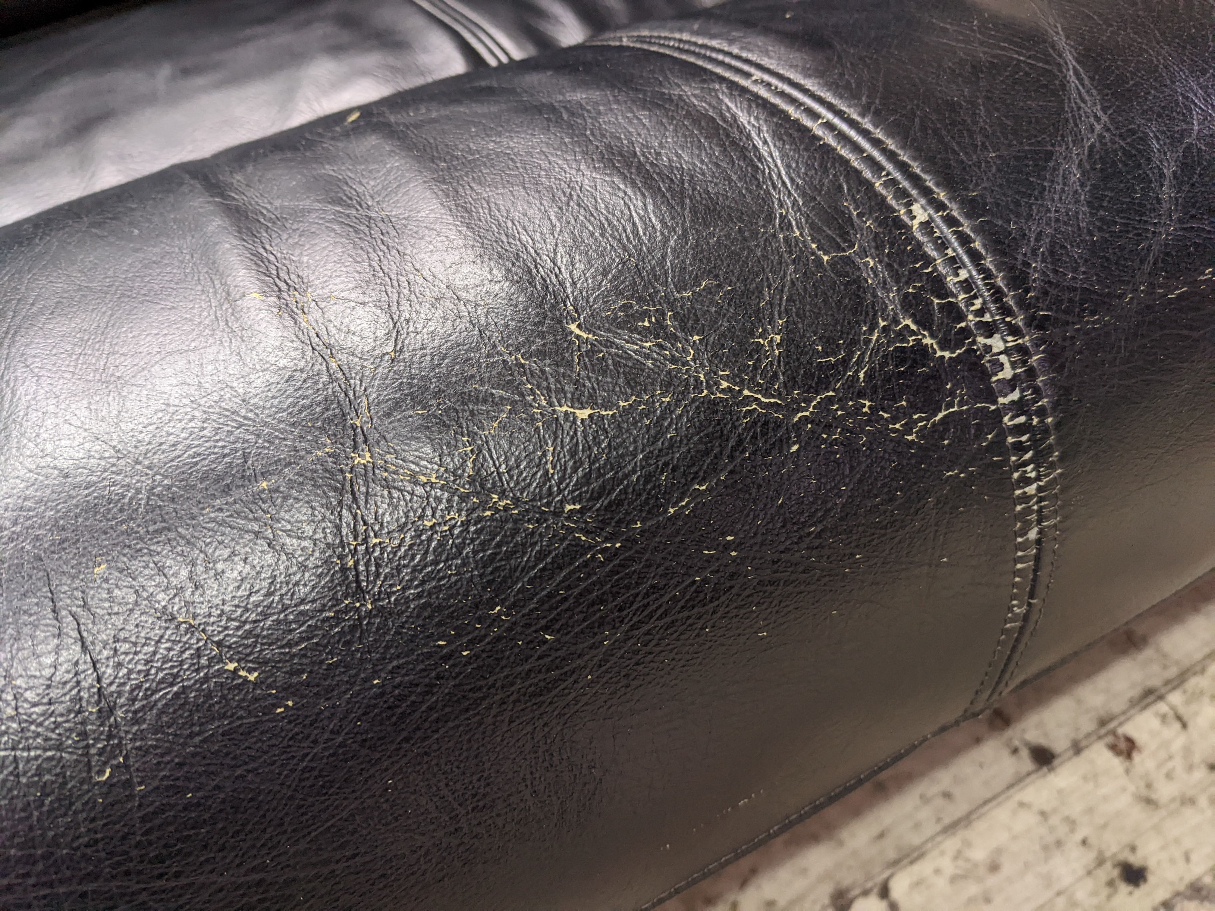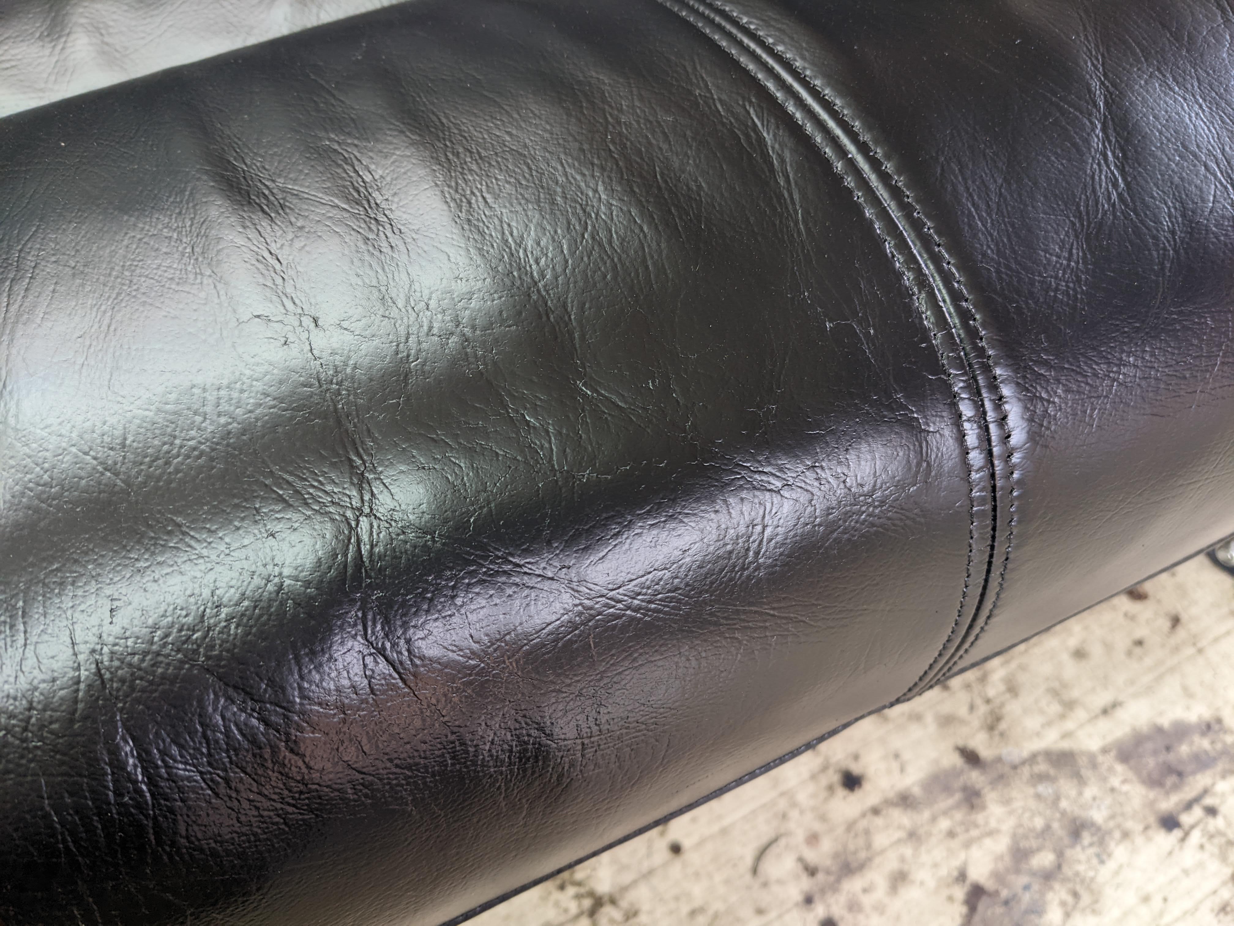 このように座面部分の革がひび割れがはじまり革の素地部分が剥き出しになってきていますね。
