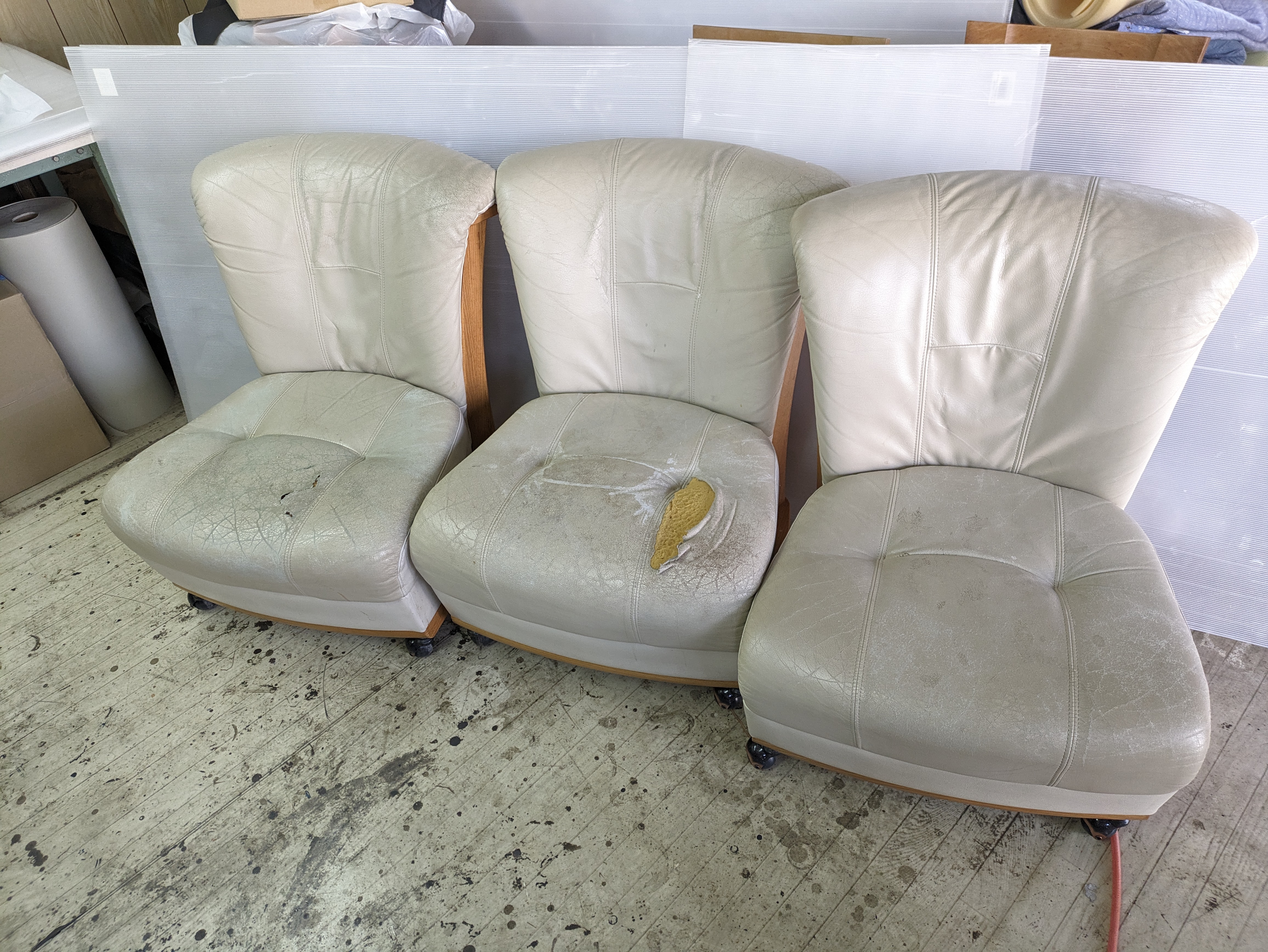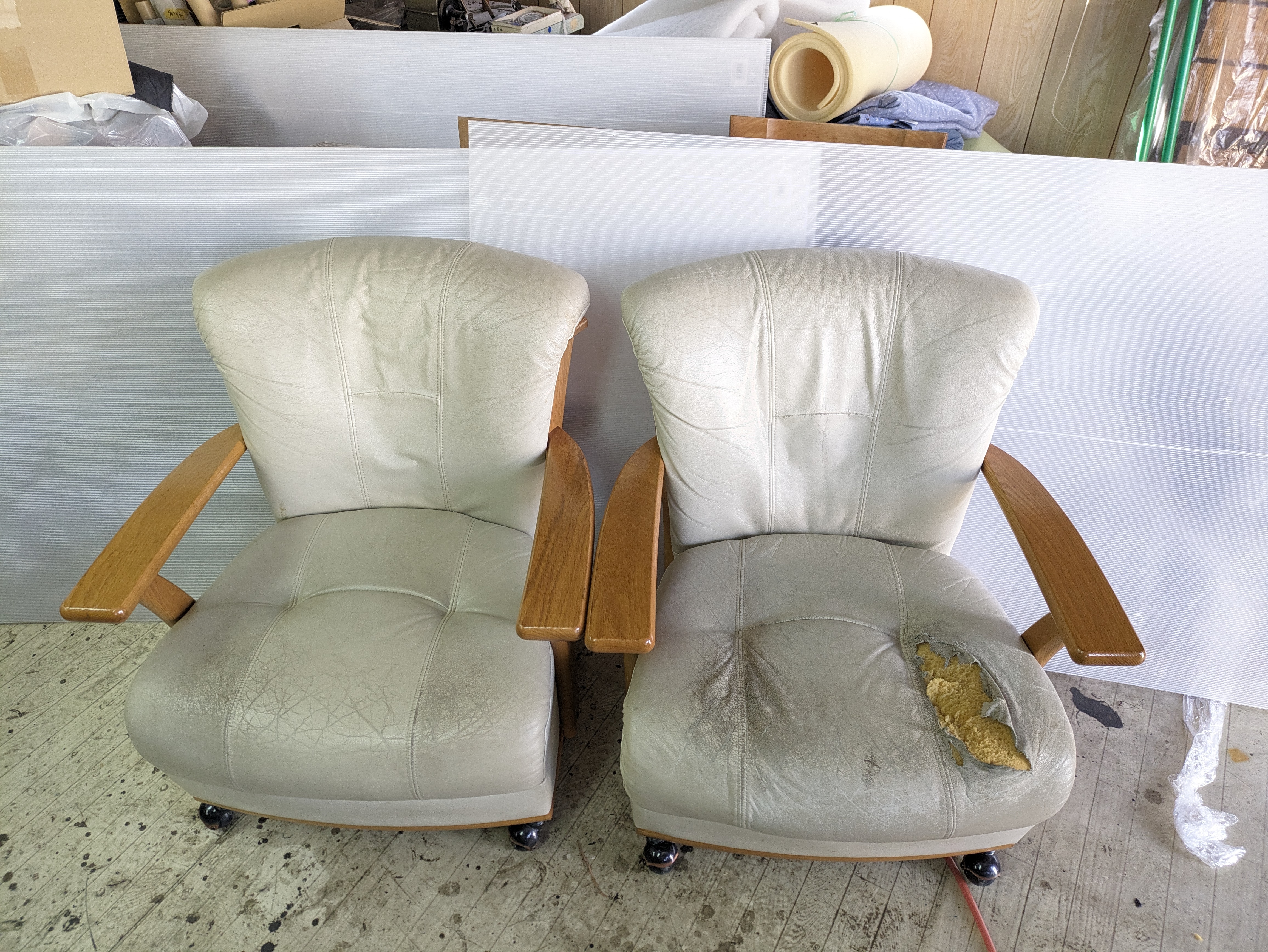 お預かりした椅子は5脚で見た目でも分かるように酷く破れている物は中身のウレタンが飛び出していますね。